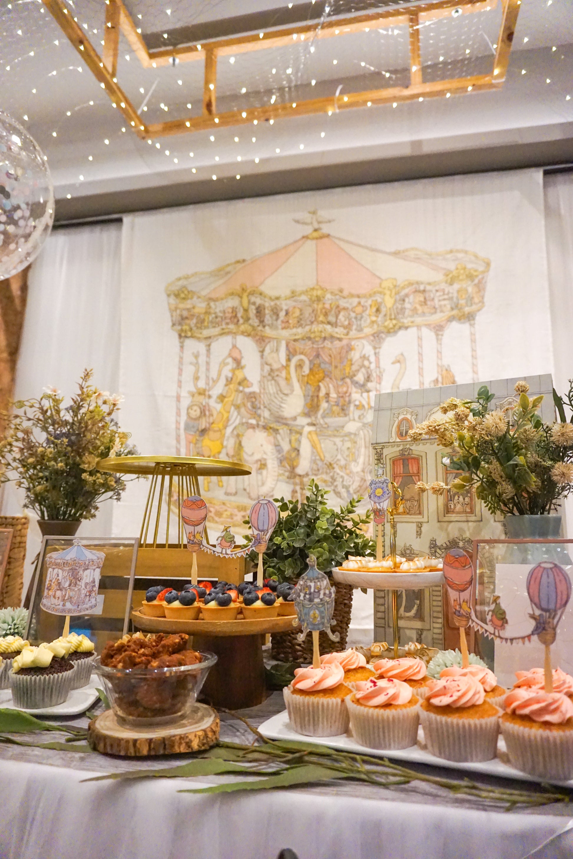 - 1 A4 poster stand, 1 cake stand, 2 wood display boxes, 1 3-tier dessert stand, 1 wooden plate, 1 2-tiered dessert stand, 2 white plates, 3 flowerpots, 2 4R photo frames, 1 glass bowl, leaves.